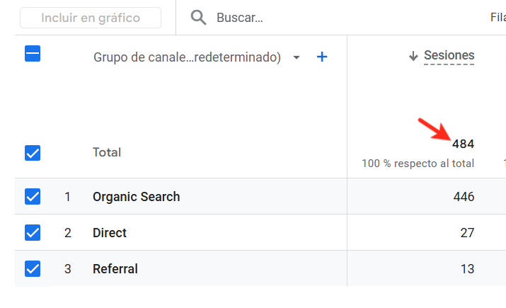 Una vez te encuentres en este espacio, podrás ver el apartado «Sesiones» el tráfico que recibes:
